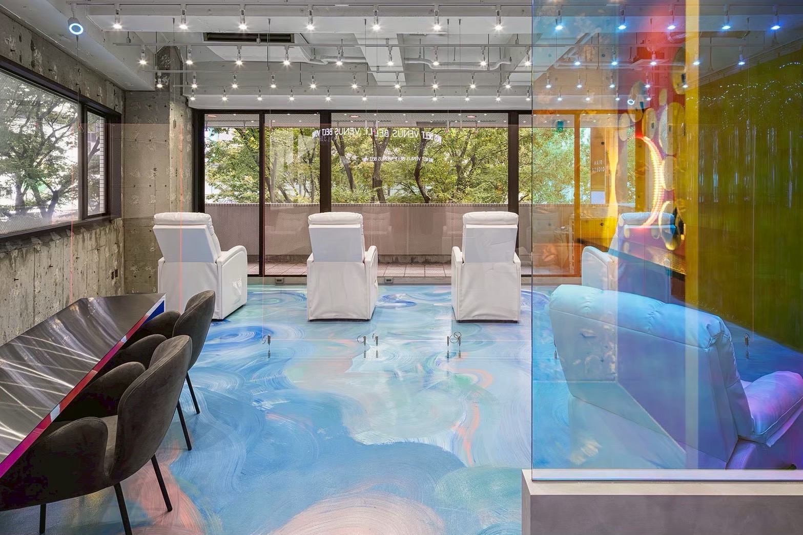 店内は、床に描かれたペイントアートが大胆で目を惹き、唯一無二の世界観をもたらしています。アクリルボードやミラーで仕切られたブースは異素材を組み合わせ、光の加減によって表情が変わる空間を演出しています。開放感のある店内にネオンサインが輝き、近未来的で遊び心あるデザインとなっています。